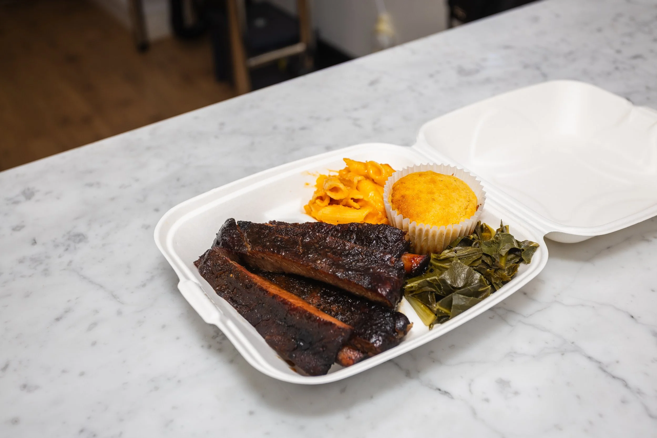 Richards Too Good Applewood Smoked Ribs, Collard Green, Mac & Cheese, Honey Cornbread